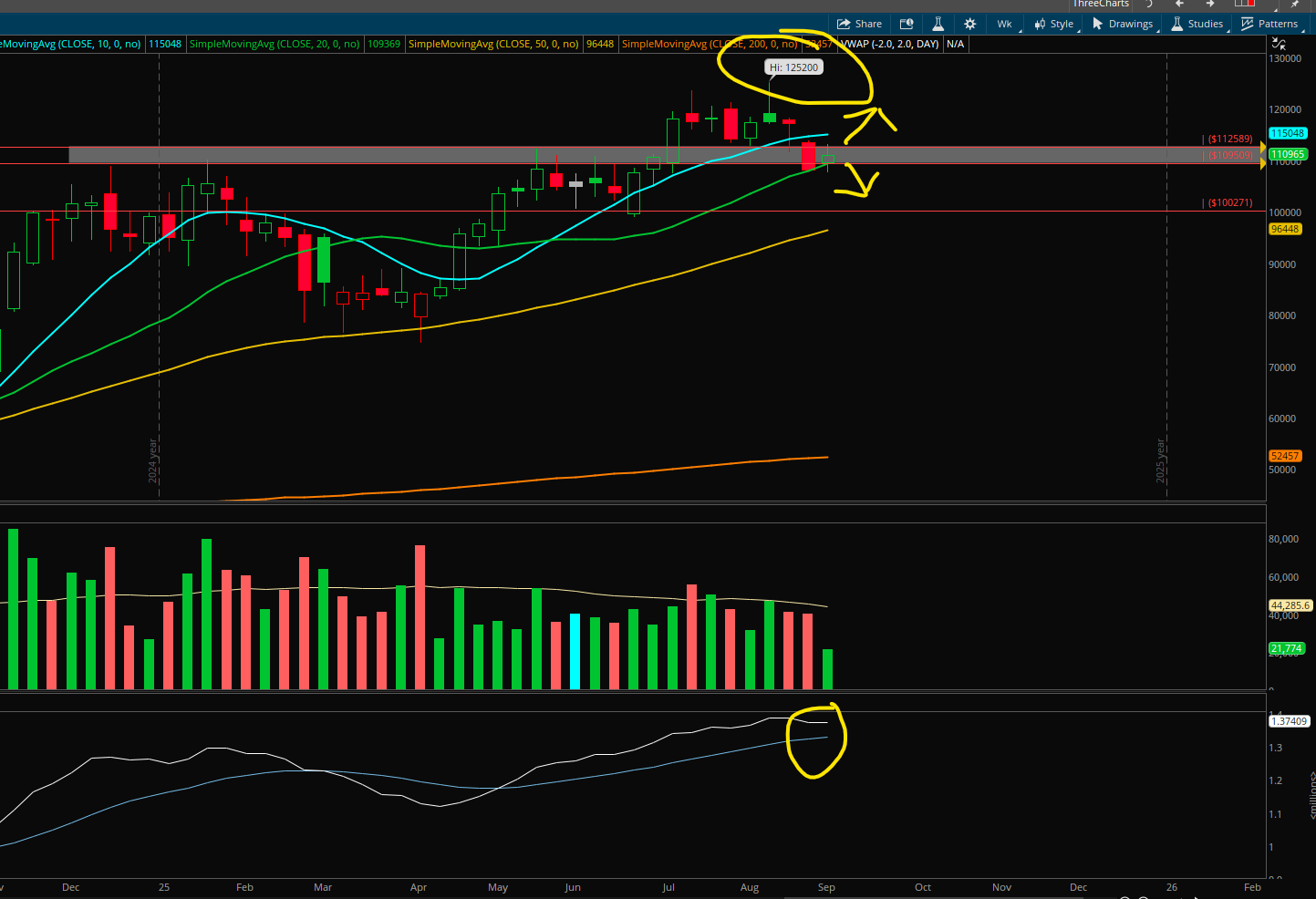 Downside risk: Price could retest the $105K area as near-term support. A break below that level may open the door to the 50-week moving average near $100K.