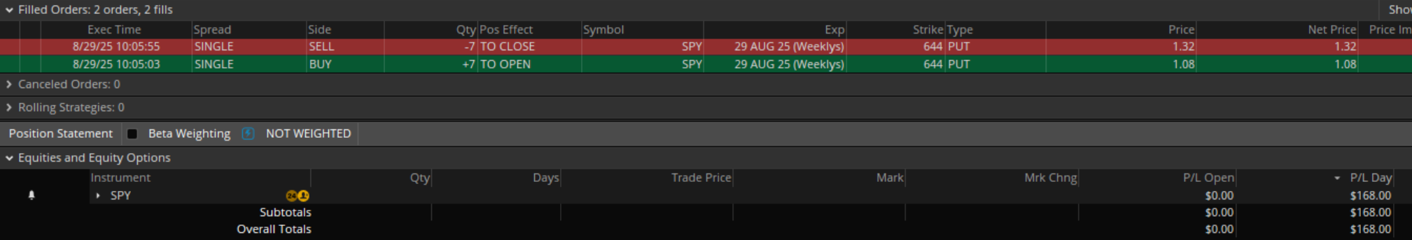 In today’s trading the session the S&P 500 filled the gap down and so I lost $34 in 646 calls. I quickly switched to 643 0DTE puts and made $27 on the downward movement. At around 10am the market rebounded breaking 646 resistance and closing the gap above at an attempt to hit all-time highs. I’m swinging a 648 call that is currently $133 in profit. I’m expecting the S&P 500 to hit all times on 9/5/2025.
