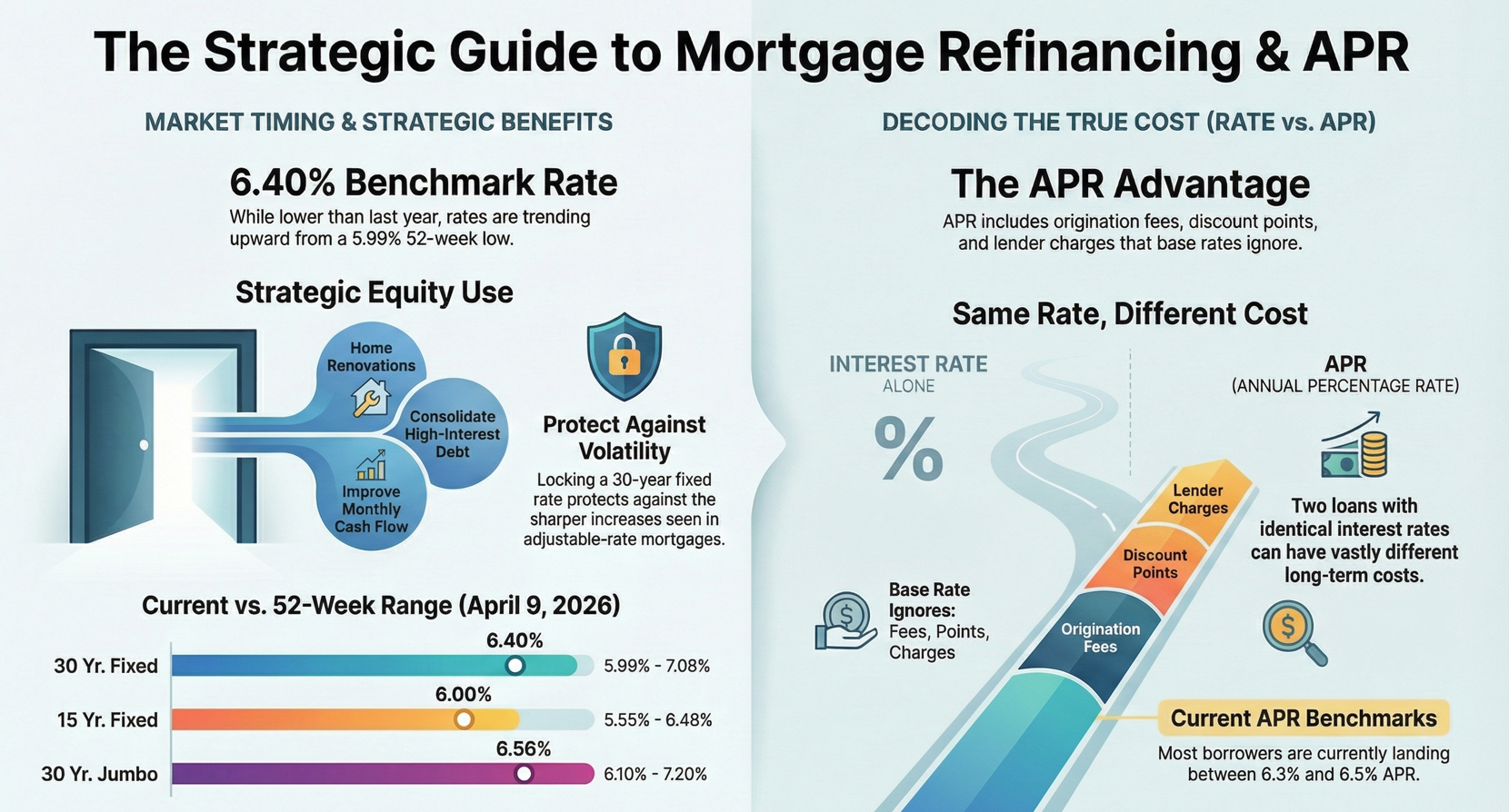 However, it’s important not to be fooled by a seemingly low interest rate. While the rate determines your monthly principal and interest, it doesn’t reflect the full cost of the loan, including origination fees, discount points, and other lender charges. Two loans with the same interest rate can have very different APRs—and very different long-term costs. By focusing on the APR, you see the true cost of the loan, enabling smarter comparisons, avoiding hidden fees, and choosing the option that actually saves you money. Refinancing at the right time, with a clear understanding of both your rate and APR, is a powerful way to strengthen your financial position and gain confidence in your mortgage decisions.