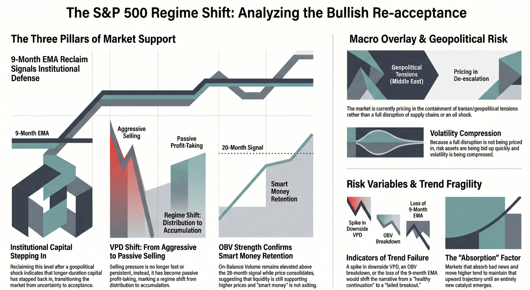 SPY is currently maintaining a bullish structure, supported by multiple confirming factors. Its move back above the 9-month EMA suggests that the broader uptrend remains intact and that institutional buyers have stepped in to defend key levels after recent geopolitical uncertainty. At the same time, the VPD indicator reflects a decline in selling aggression, indicating that downside pressure is easing and that recent selling is likely more passive than forced. This is reinforced by On-Balance Volume holding above its 20-month signal line, which signals that accumulation remains intact and that large participants are not exiting positions in size. Altogether, these elements point to continued buyer control and a stabilization of market conditions, with a bias toward further upside. However, this outlook remains sensitive to developments in U.S.–Iran negotiations, as any deterioration could quickly reintroduce volatility, increase selling pressure, and disrupt the current bullish trend.